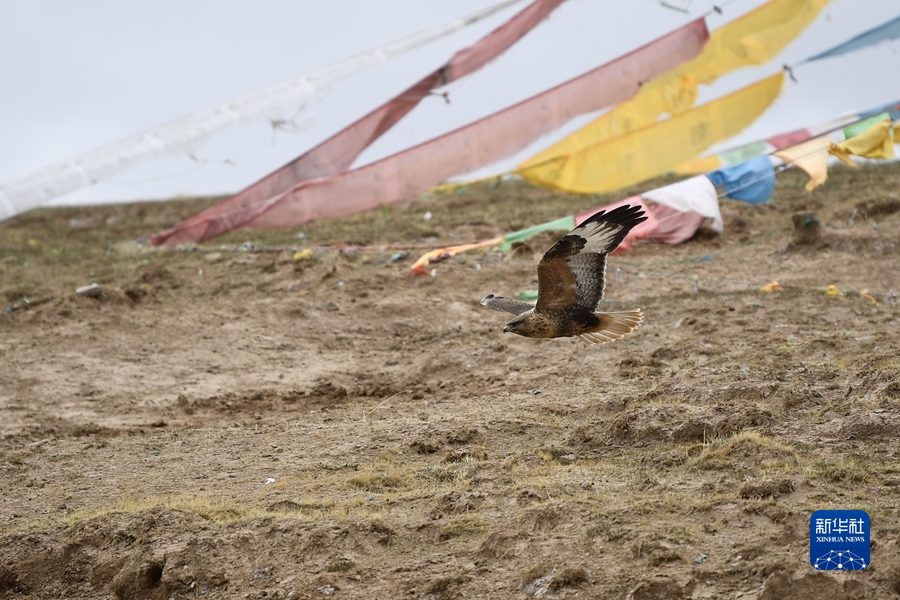 2021年5月25日,一只鹰在三江源国家公园黄河源园区内飞翔。新华社记者 张龙 摄