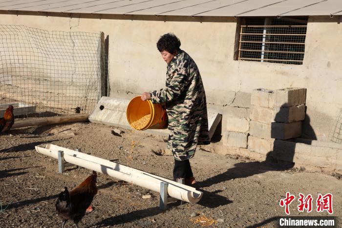 图为苏桂玲在德令哈惠然家庭农场内给鸡喂食。吴婷婷 摄