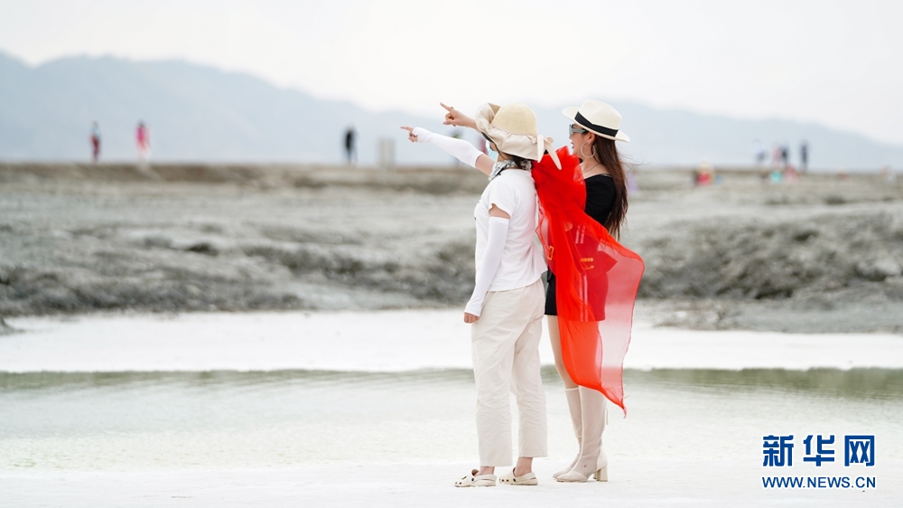 7月20日,游客在海西州大柴旦行委境内的翡翠湖游玩。