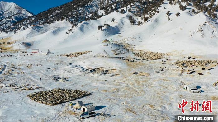 图为村民在雪地上放牧。都兰县融媒体中心供图