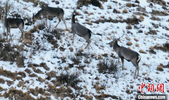 初冬时节,地处柴达木盆地腹地的青海省海西蒙古族藏族自治州都兰县境内,近百只岩羊和马鹿集体在雪地里奔跑,觅食,场面壮观。