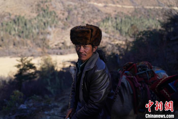 正值寒冬,丹增培楚牵着骡马队从香格里拉高原牧场的群山之间缓缓走来,马帮的铜铃发出叮叮当当的乐章。