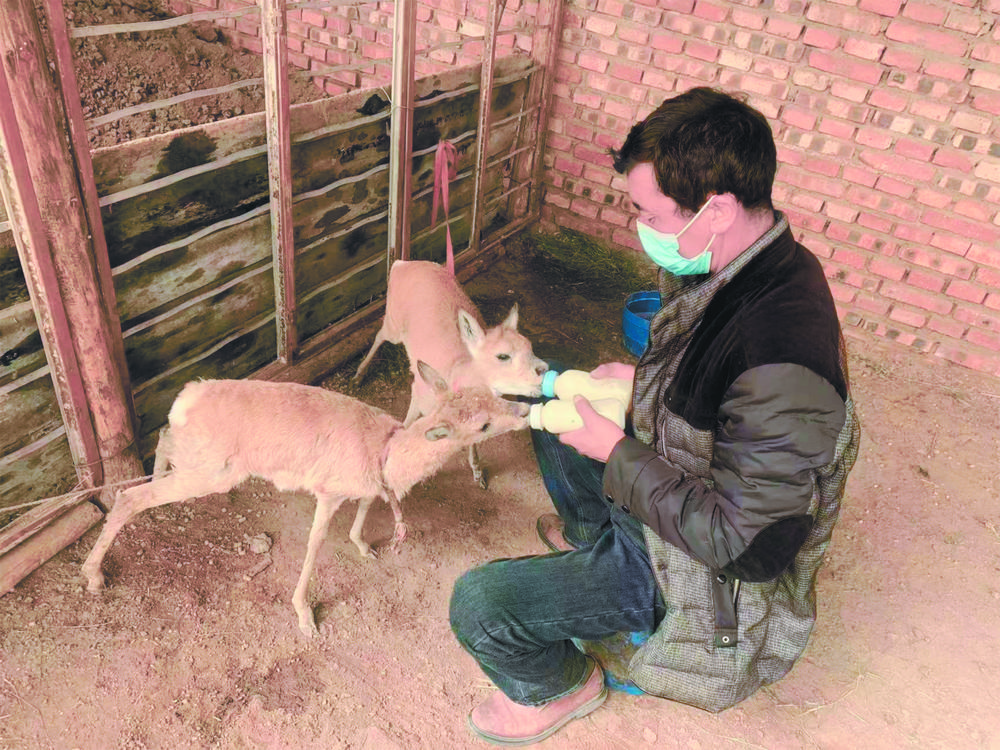 哈尔盖镇牧民在喂养救助的小普氏原羚。