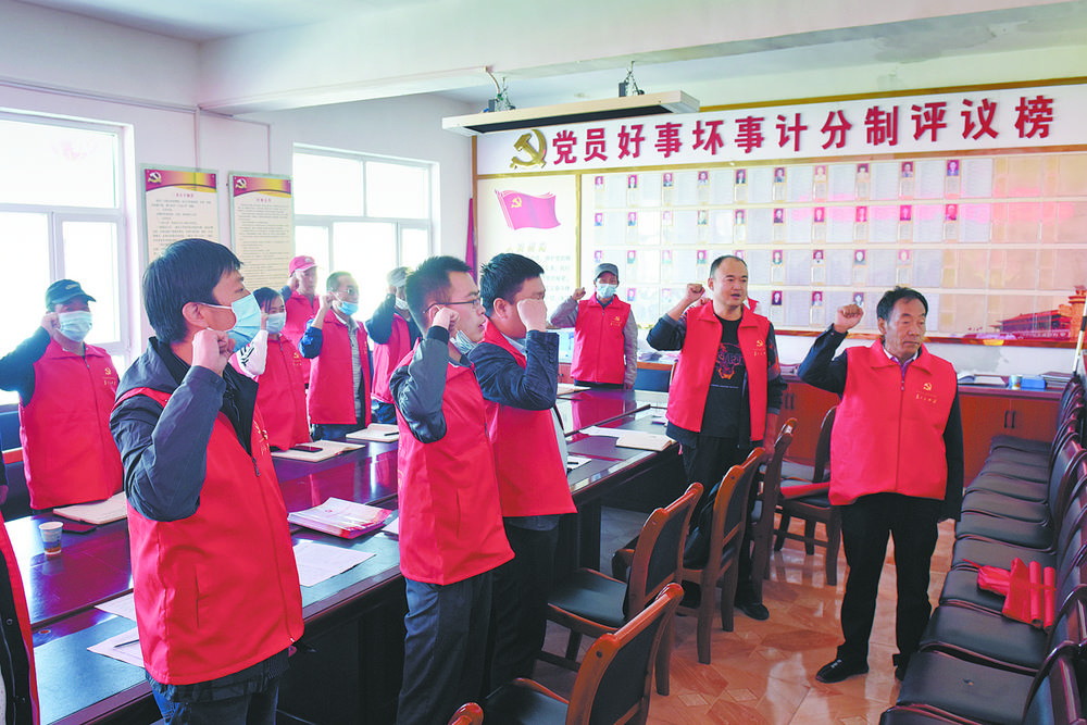 海晏县金滩乡东达村党支部党员面向党旗宣誓。