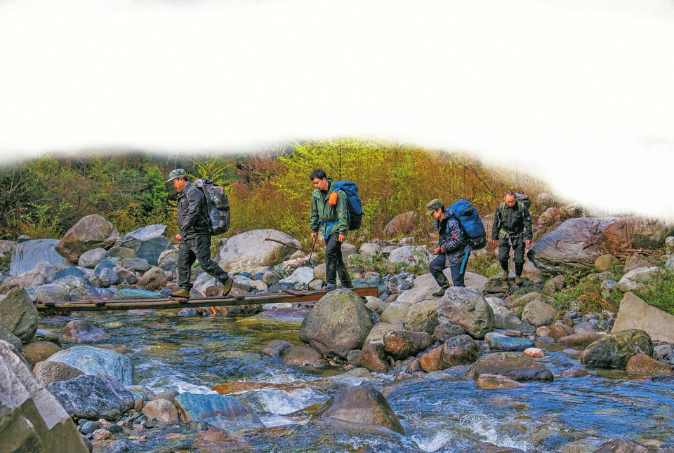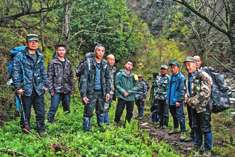 钟俊德(左三)等巡护队员参与大熊猫国家公园老河沟片区与新驿村进行的联合巡护。