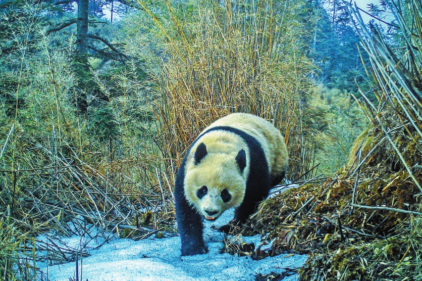 四川平武拍摄到野生大熊猫雪地撒欢画面