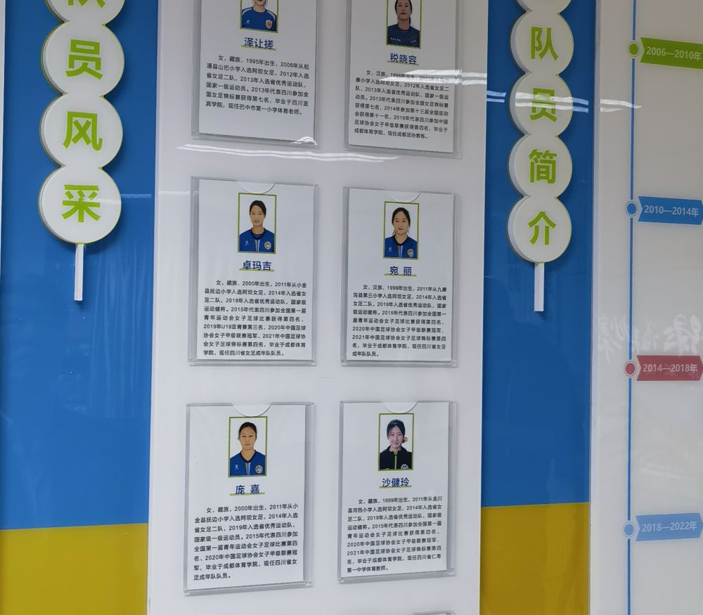 17年来,一批又一批的队员走出了大山。“她刚来时又黑又瘦,现在完全不一样了。”张金文指着荣誉墙上的照片说,照片上的女孩叫卓玛吉,2011年她从小金县云门村来到球队,那是11岁的卓玛吉第一次出远门。