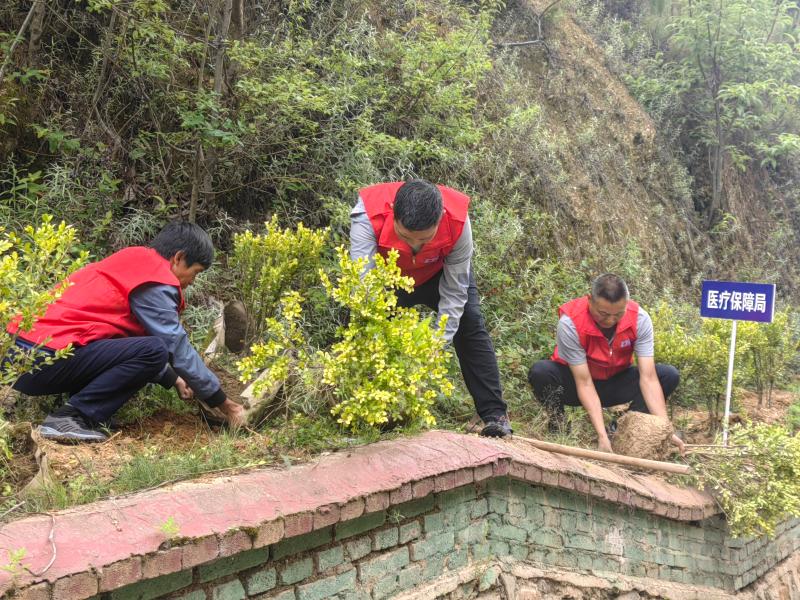 大家三五成群,有的用锄头铲草,有的挥锹挖坑,搬运树苗、培土浇水……大家密切配合,各环节井然有序。