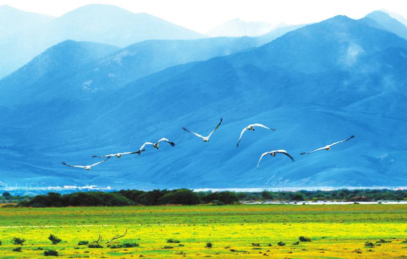 白鹤飞越草原。旺修 摄
