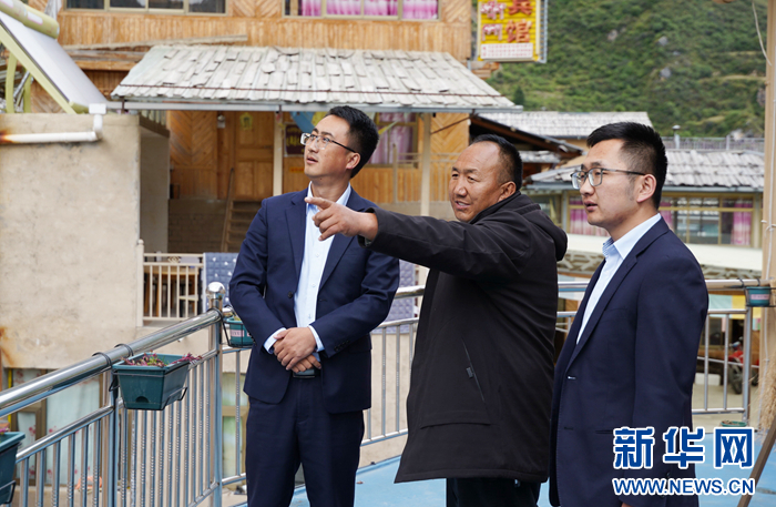 旺青闹加(中)向邮储银行工作人员介绍村子发展情况。新华网 铁梁 摄