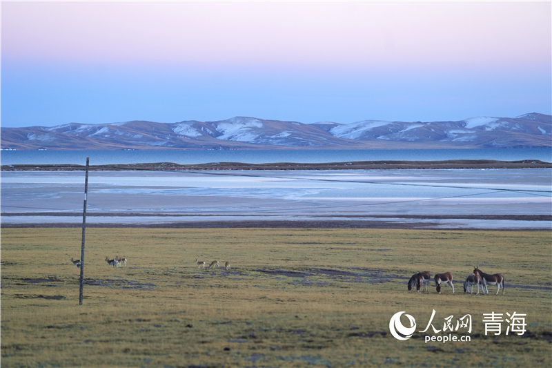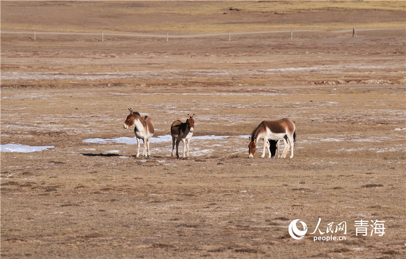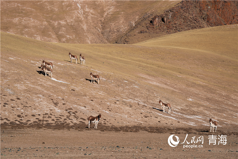 成群的藏野驴在鄂陵湖周边觅食。人民网 白波 摄