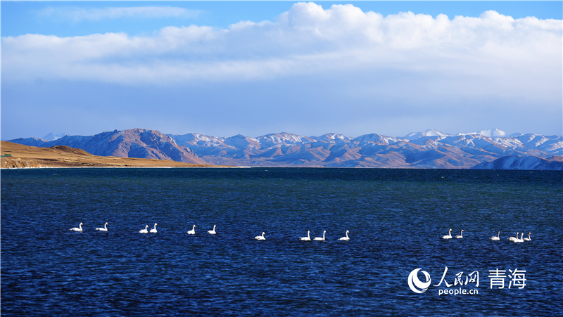 大天鹅在冬格措纳湖“翩翩起舞”。人民网记者 杨启红 摄
