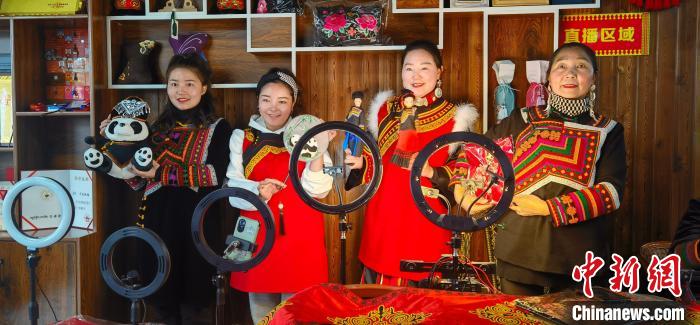 资料图为乔进双梅(左三)通过直播带货拓宽彝绣产品销路。受访者乔进双梅供图