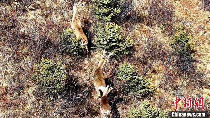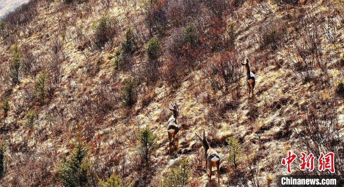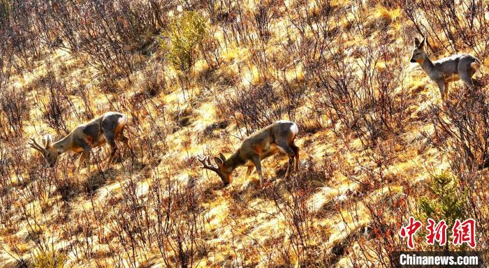 日前,摄影爱好者在地处长江源上游主要水源地的青海省果洛藏族自治州班玛县马可河流域拍摄到三只国家二级保护动物狍鹿。只见三只狍鹿在灌木丛中漫步觅食,面对无人机的镜头也并不显惊慌,显得悠闲自得。这也是班玛县的狍鹿离人群最近的一次。