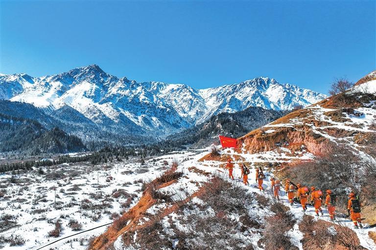 3月7日,在肃南县马蹄藏族乡祁连山深处,张掖市甘州区森林消防大队的消防员们携装穿行林海雪原间开展巡护作业。他们肩负着守护31.53万公顷森林、16个国有林场和12个自然保护站安全的重任。
