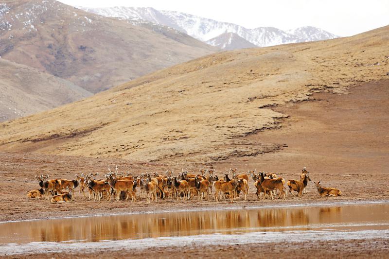 成群的白唇鹿在水源边休憩。甘孜州林业和草原局供图