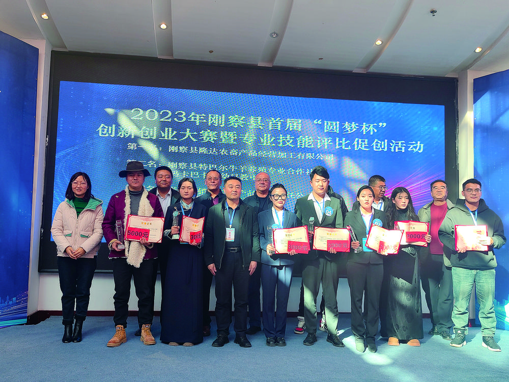 刚察县创业大赛上寇天芬(左起前排第五)获得二等奖。人社局供图