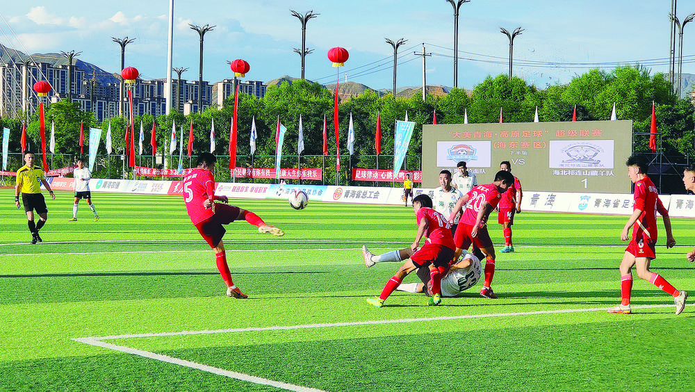 第一个进球后,海东队持续发动进攻,多次制造威胁,海北队争抢激烈,上半场进行到23分钟时,海东队再进一球,以2比0的比分暂时领先。攻防不断转换,海北队也不甘示弱,通过高举高打的战术,突破海东队防线,将比分扳为2:1。