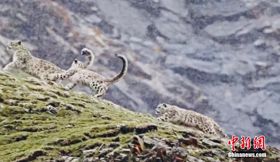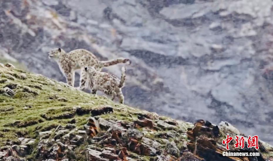 图为雪山上豹妈带娃在山坡上嬉戏玩耍。宋宇 摄