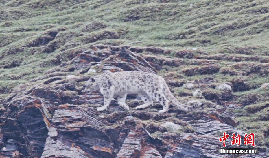 图为雪豹妈妈带娃在山坡上行走。宋宇 摄