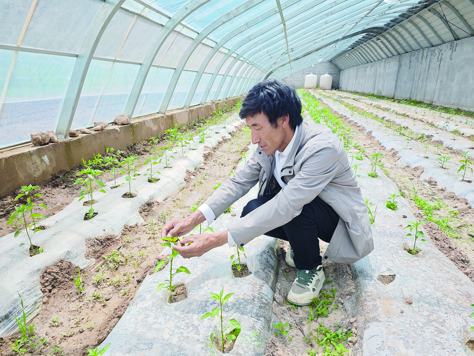 山脚下的一片平地上,一排排温室大棚整齐排列着,十分显眼。进入温棚,一股热浪袭来,青椒、西红柿、土豆……一片片翠绿的种苗映入眼帘,温棚的“主人”成林向我们介绍:“这批青椒是六月初种的,差不多到七月底就可以采摘、销售了,隔壁棚里种的是西红柿,今年西红柿的长势比较好。”