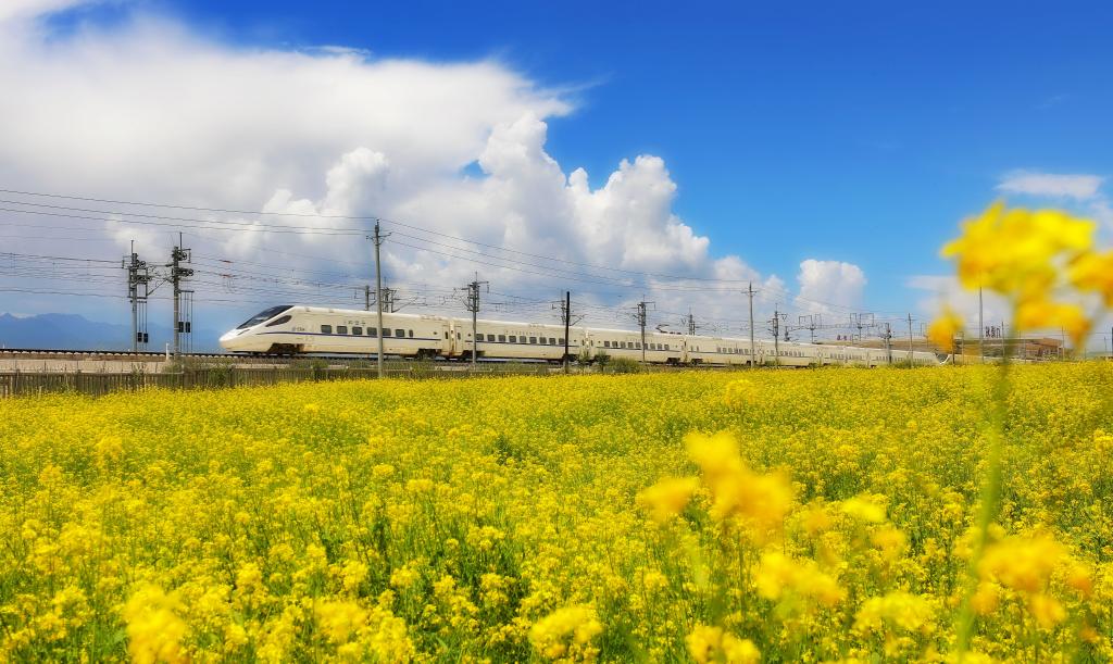 动车驶过门源油菜花海。新华社发(郝宝君 摄)