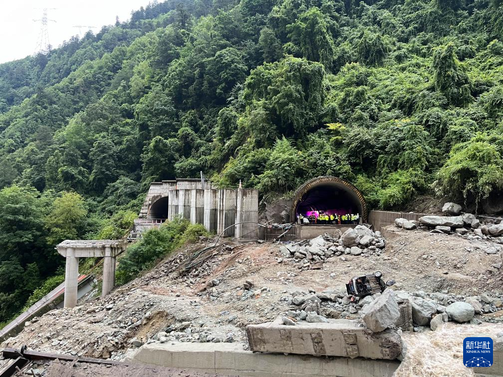 这是雅康高速四川甘孜藏族自治州康定至泸定段日地1号隧道至2号隧道隧间桥垮塌现场(8月3日摄)。新华社发