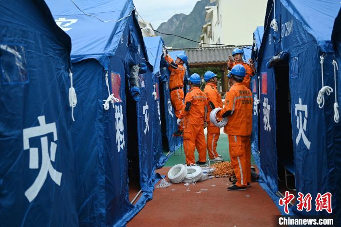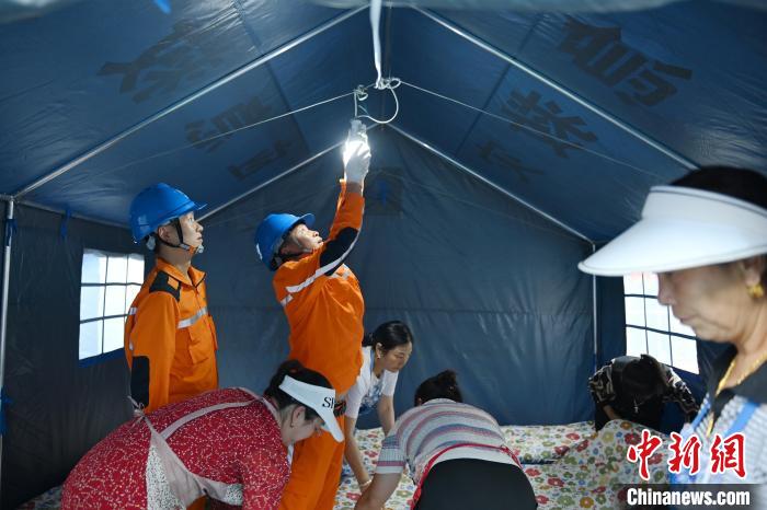 8月3日,康定姑咱镇郎鼓村临时安置点,电力抢险人员正在接通照明用电。中新社记者 刘忠俊 摄