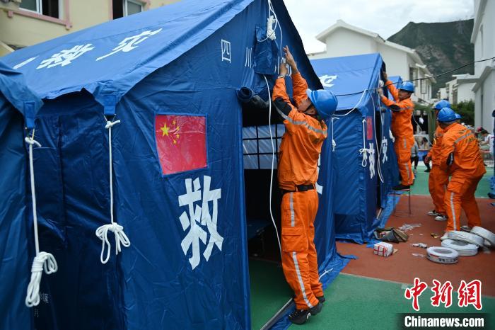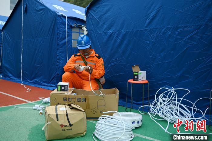 8月3日,康定姑咱镇郎鼓村临时安置点一顶帐篷内,电力抢险人员为帐篷接通照明用电。中新社记者 刘忠俊 摄