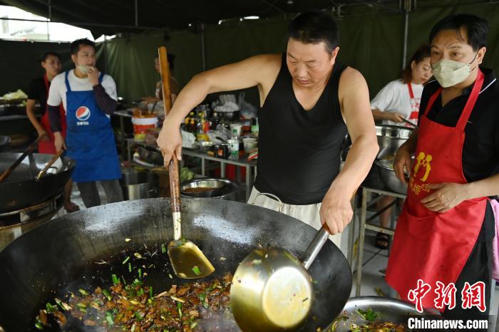 8月3日,康定姑咱镇郎鼓村临时安置点内,厨师正在准备晚餐。中新社记者 刘忠俊 摄