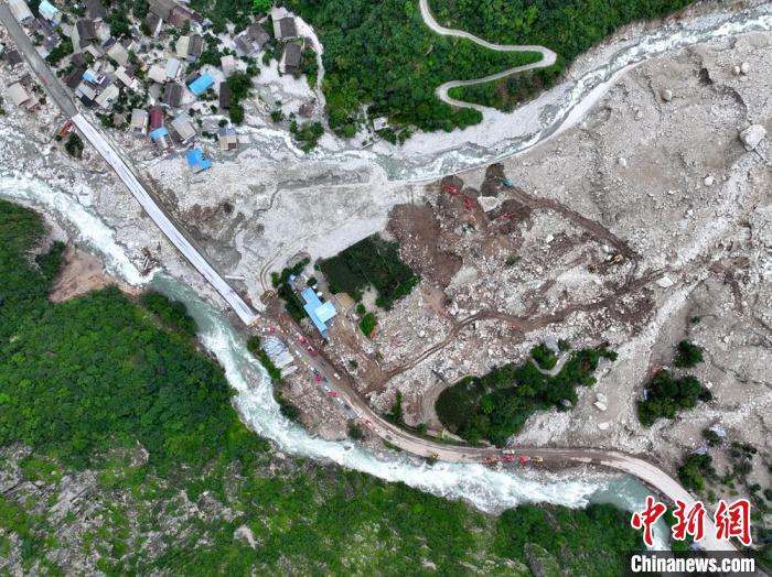 8月6日,康定山洪泥石流灾害现场,318国道受灾段已抢通。(无人机照片)中新社记者 刘忠俊 摄