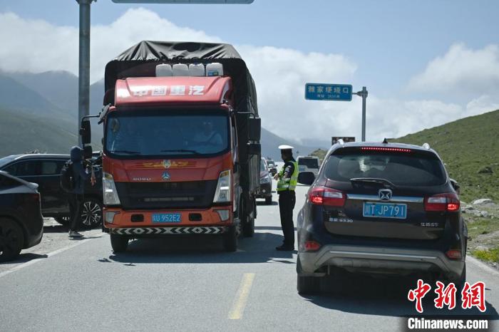 8月6日,省道434线榆磨路雅家埂垭口,交警正在疏导过往车辆。中新社记者 刘忠俊 摄