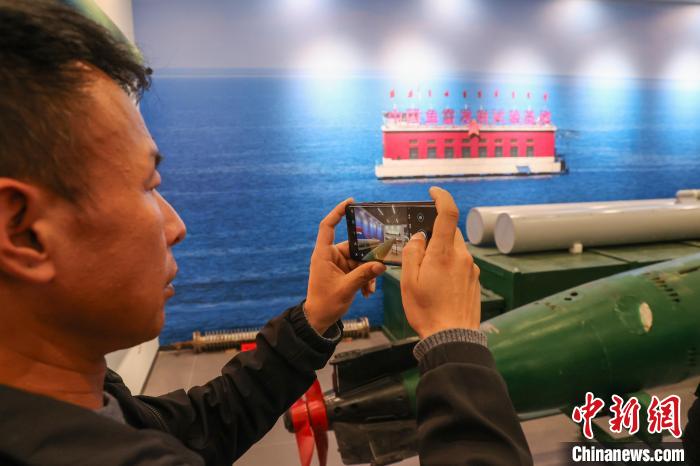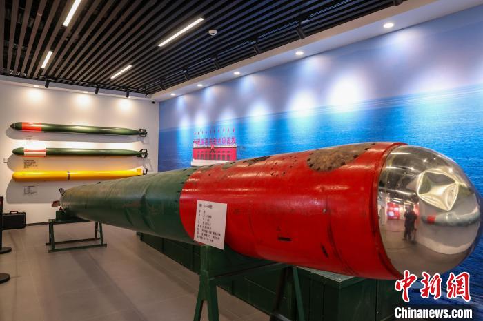 9月25日,在青海省海南藏族自治州共和县,青海湖二郎剑景区内的中国第一代鱼雷试验基地纪念馆,馆内陈列的鱼雷模型。1968年,名为“山鹰机械厂”的鱼雷试验靶场在青海湖南岸建立,这里也曾是我国海军的鱼雷发射试验基地。如今,湖面上的基地遗址已成为青海湖的爱国主义教育基地。中新社记者 薛蒂 摄