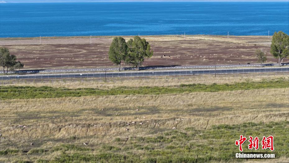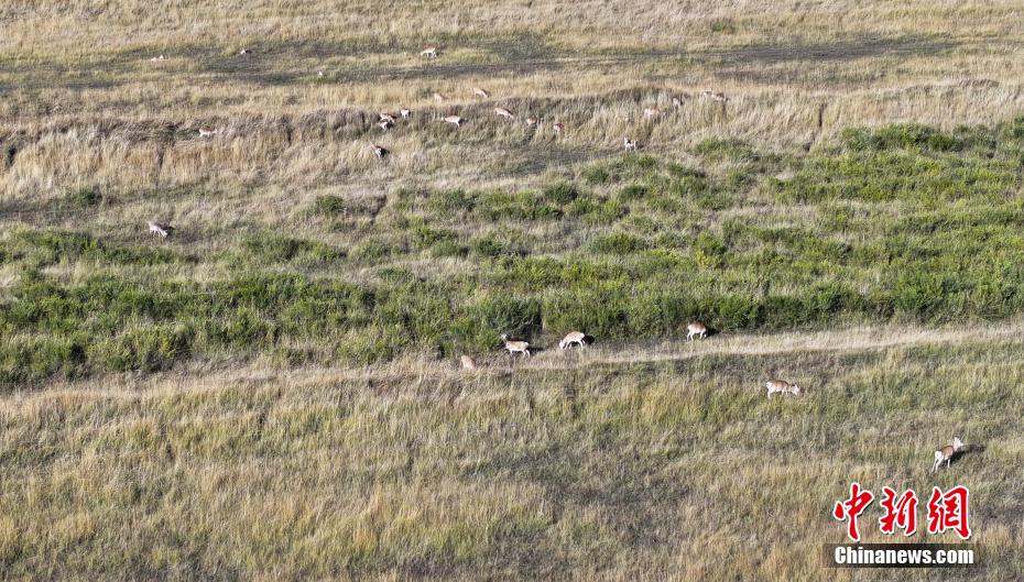 图为青海湖畔,普氏原羚悠闲觅食。(无人机照片)中新社记者 马铭言 摄