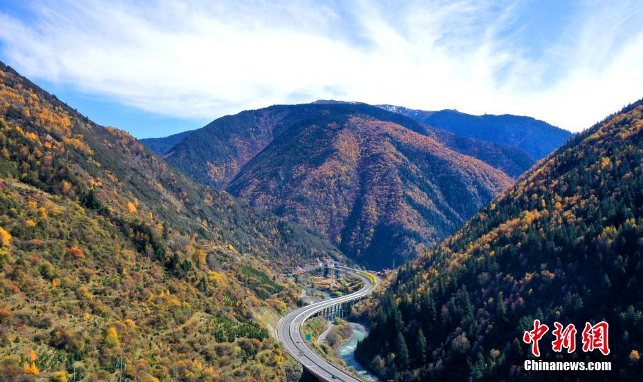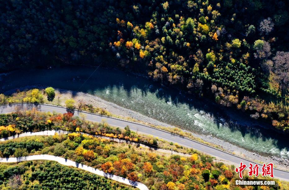 图为梭磨河峡谷彩林风光。(无人机照片)中新社记者 安源 摄