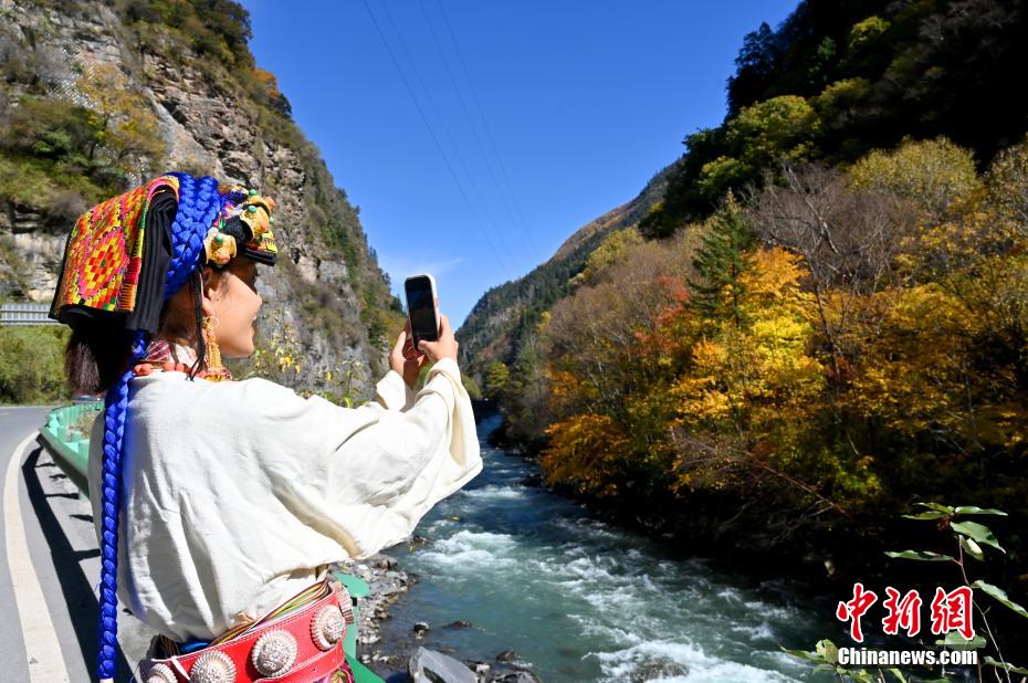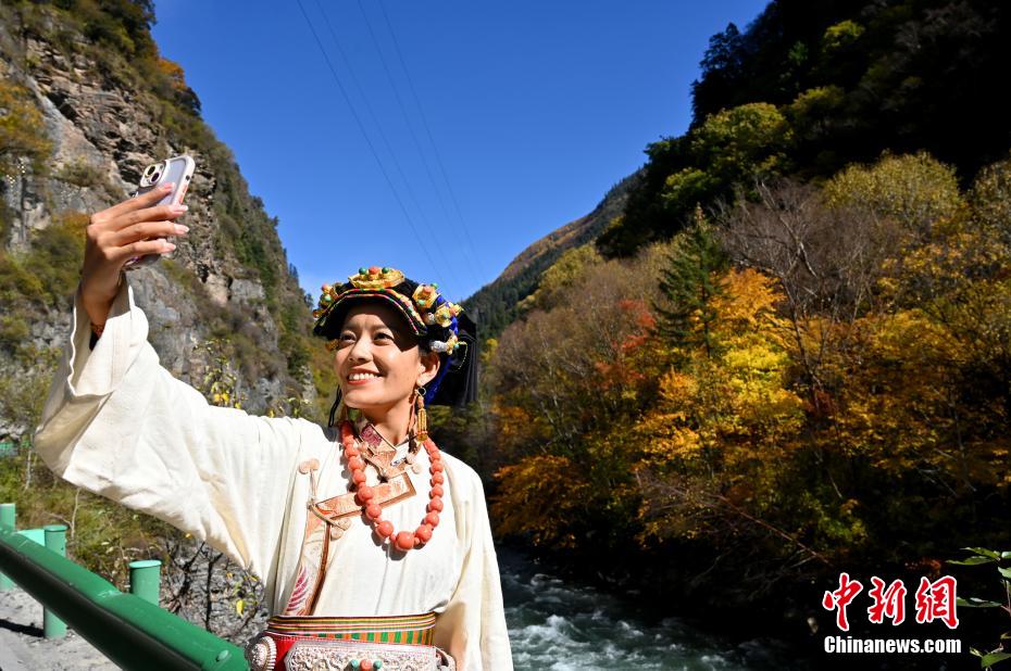 图为藏族姑娘在彩林观赏区拍照留念。中新社记者 安源 摄
