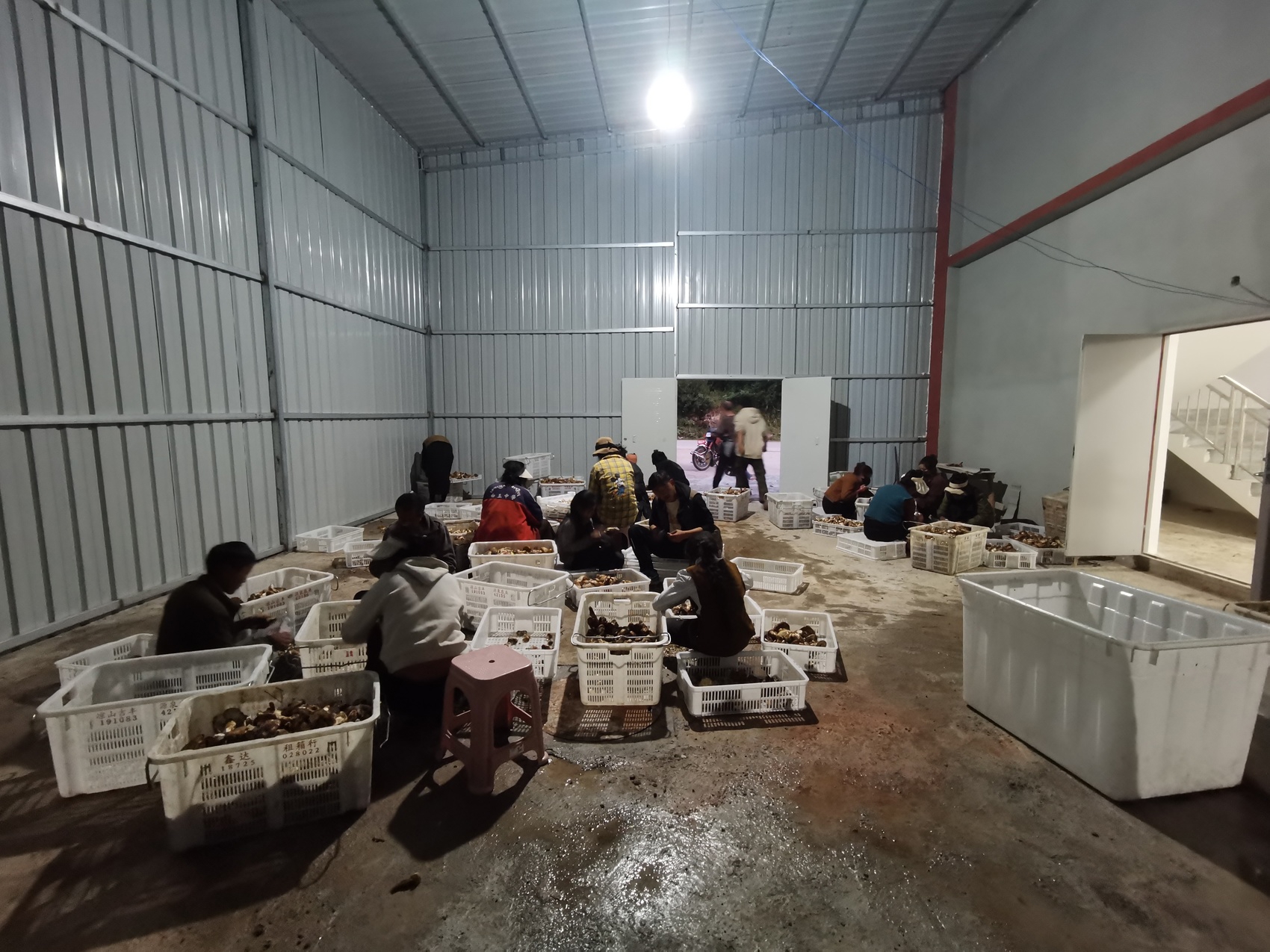 德西村的菌类加工车间内,工人们在进行初步分拣。受访者供图