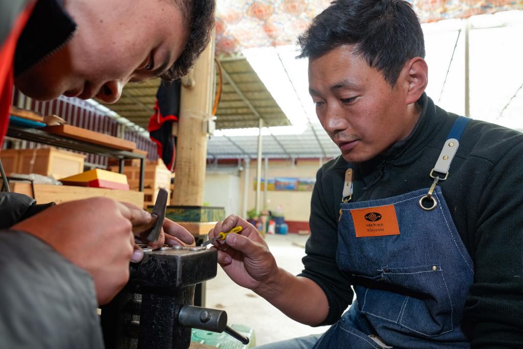 在2024年德格县“善地文创手艺人”特色劳务品牌培训班上,达瓦扎巴(右)指导一名当地学徒用传统银包铜工艺制作文创产品(11月3日摄)。新华社记者 沈伯韩 摄