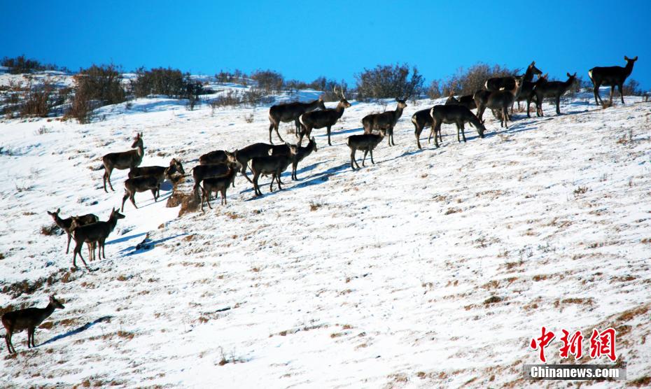 图为马鹿、狍鹿在覆雪的草原上成群出游。牛继荣 摄