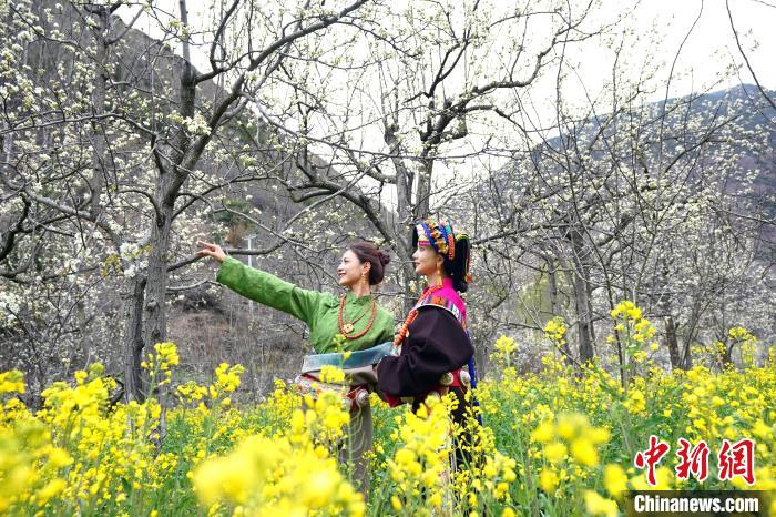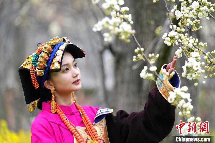 图为藏族姑娘在梨树间赏花。中新社记者 安源 摄