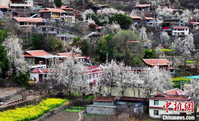 图为梨花丛中的村寨。中新社记者 安源 摄