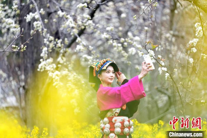 图为藏族姑娘在梨树下拍照。中新社记者 安源 摄
