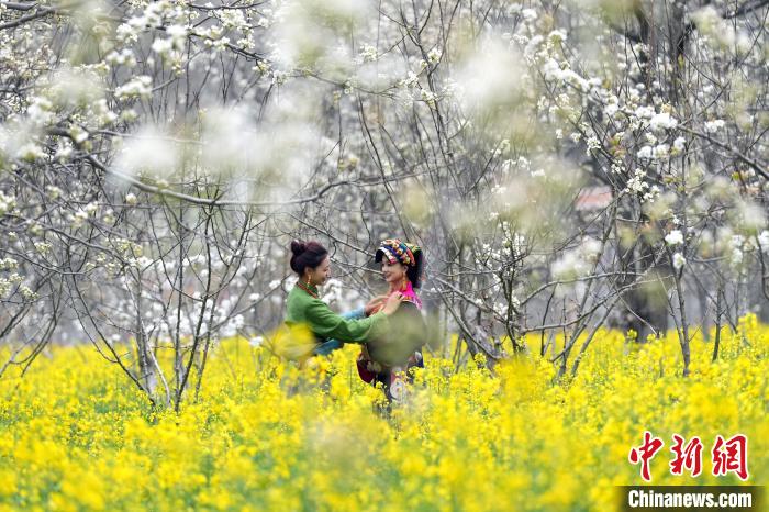 图为藏族姑娘在梨树下玩耍。中新社记者 安源 摄