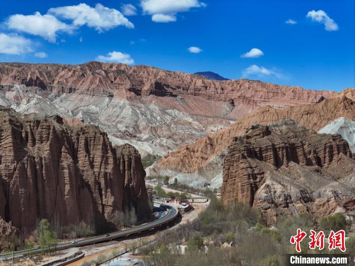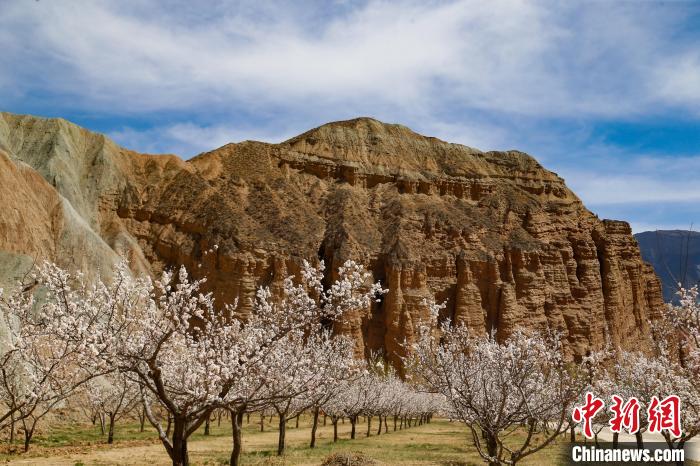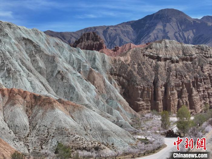 图为盛开的杏花映衬着多彩的丹霞地貌。中新社记者 马铭言 摄