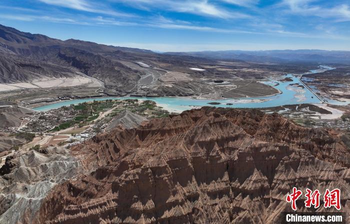 图为连绵的丹霞与清清黄河相互映衬。(无人机照片)中新社记者 马铭言 摄