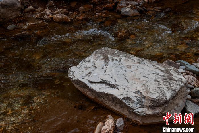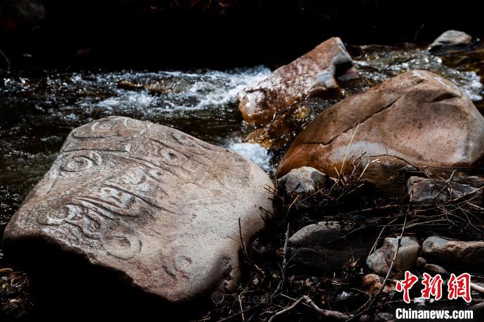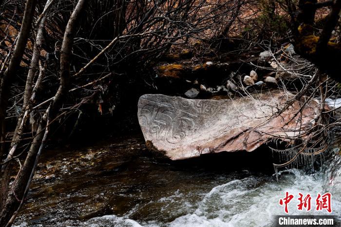 4月12日,青海省玉树藏族自治州玉树市勒巴沟内的“水玛尼”。勒巴沟藏语意为“美丽的沟”,沟内保留着距今1300多年的岩画。沟内两侧山体上刻有石刻经文,被称为“山玛尼”。溪水流经之处还有独特的“水玛尼”景观。 中新社记者 薛蒂 摄