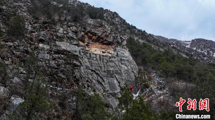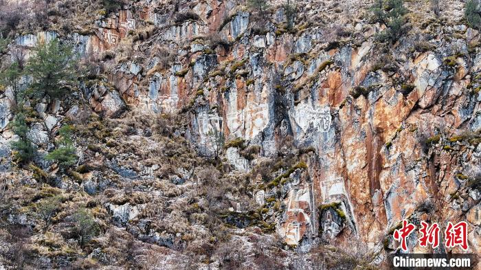 4月12日,航拍青海省玉树藏族自治州玉树市勒巴沟内的“山玛尼”。勒巴沟藏语意为“美丽的沟”,沟内保留着距今1300多年的岩画。沟内两侧山体上刻有石刻经文,被称为“山玛尼”。溪水流经之处还有独特的“水玛尼”景观。(无人机照片) 中新社记者 薛蒂 摄