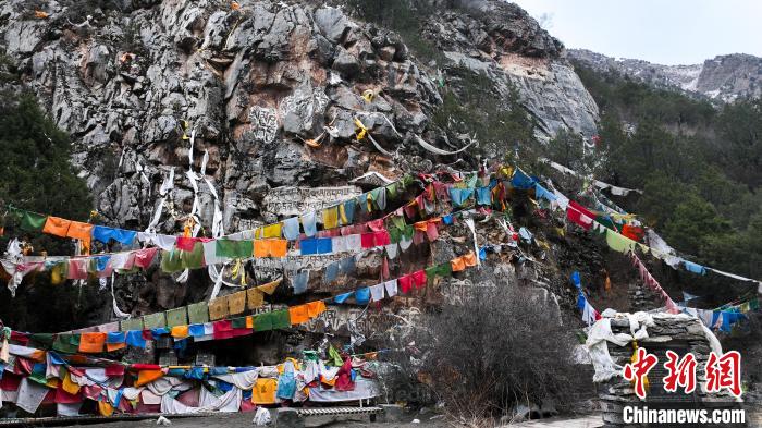 4月12日,游客在青海省玉树藏族自治州玉树市勒巴沟拍摄岩画。勒巴沟藏语意为“美丽的沟”,沟内保留着距今1300多年的岩画。沟内两侧山体上刻有石刻经文,被称为“山玛尼”。溪水流经之处还有独特的“水玛尼”景观。中新社记者 薛蒂 摄