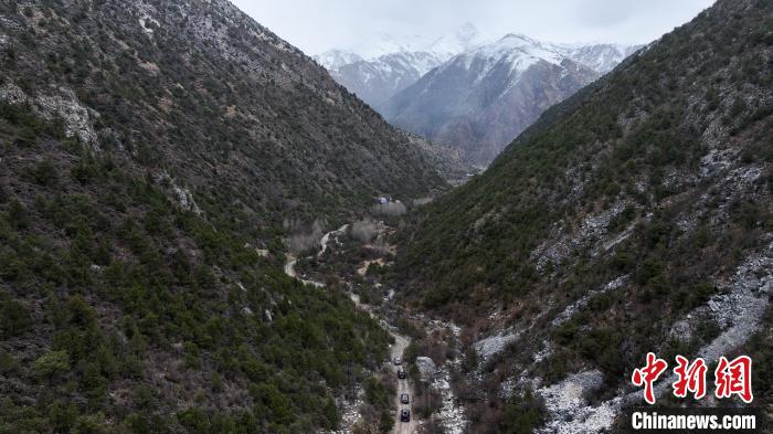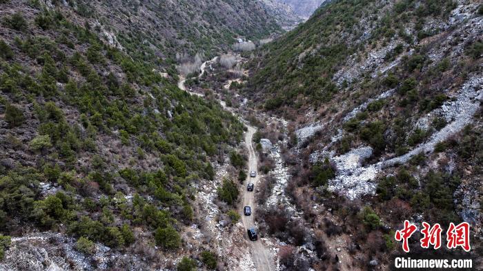 4月12日,航拍青海省玉树藏族自治州玉树市勒巴沟。勒巴沟藏语意为“美丽的沟”,沟内保留着距今1300多年的岩画。(无人机照片) 中新社记者 薛蒂 摄