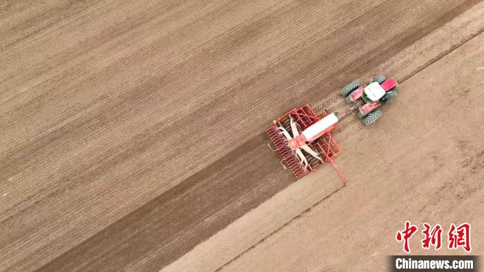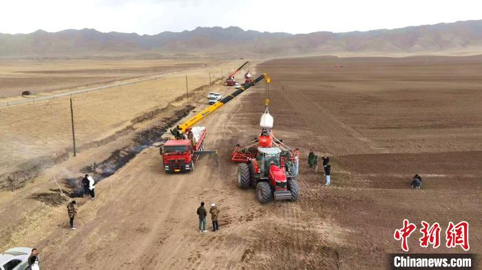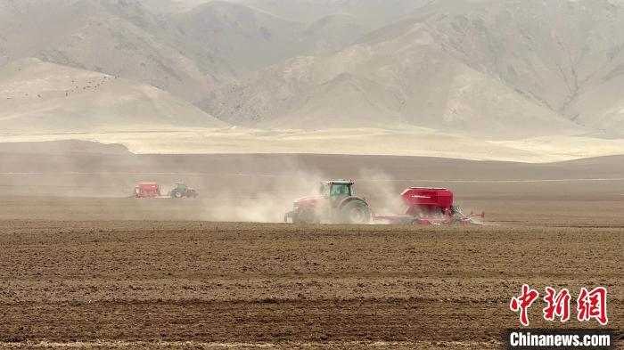 4月21日,青海省海南藏族自治州贵南县贵南牧场,大型机械正在播种青稞。该牧场今年种植青稞品种昆仑14号共5.1万亩,创全省种植青稞规模之最。